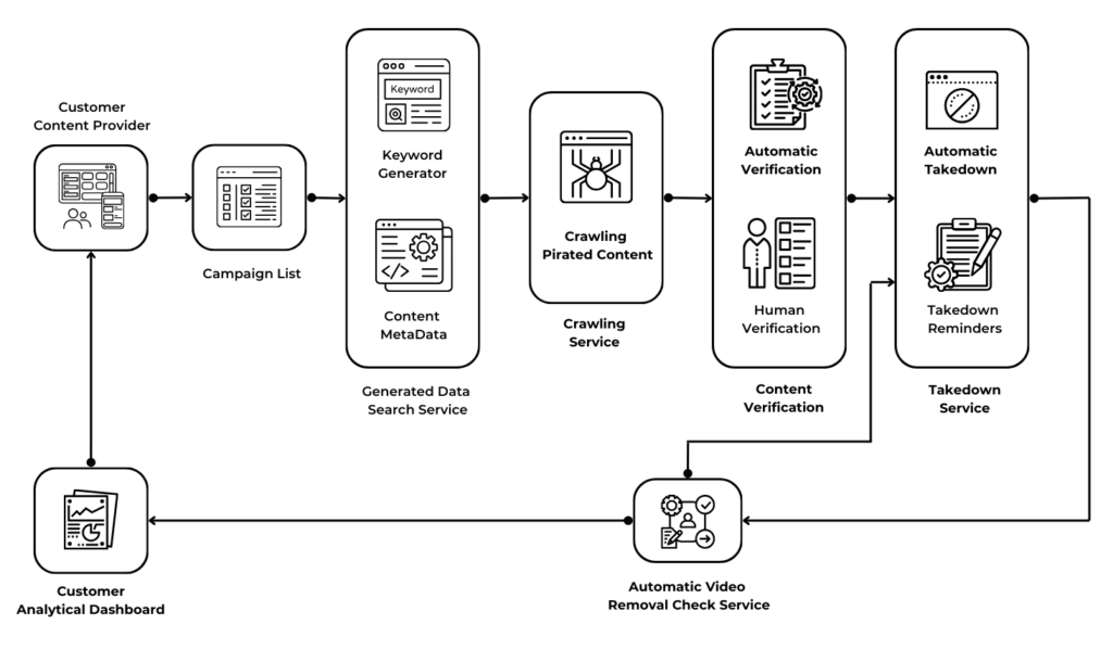 The responsibility for providing the assets or content to be monitored or taken down by the system lies with the Customer. they need to provide the necessary materials for the system to be able to search, monitor and takedown